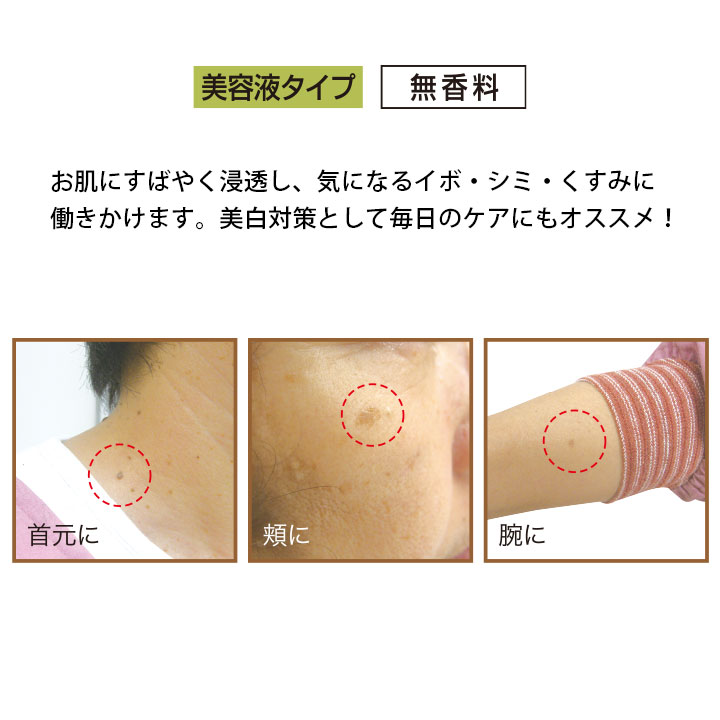 「数年後のお肌」はまるで別物です。本品はお肌にすばやく浸透し、気になるイボ・シミ・くすみに働きかけます。