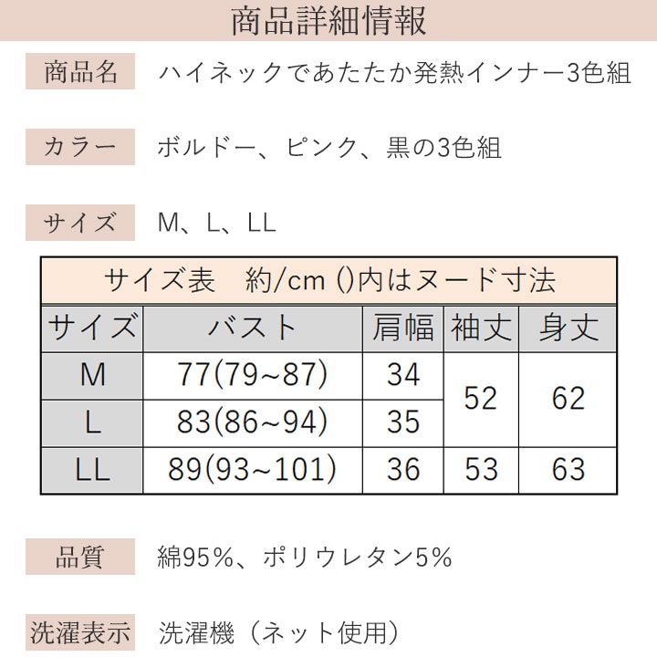 レディースファッション > インナー > 即納★【在庫限り】【70353】【レディースインナー】ハイネックであたたか発熱インナー3色組 961340
