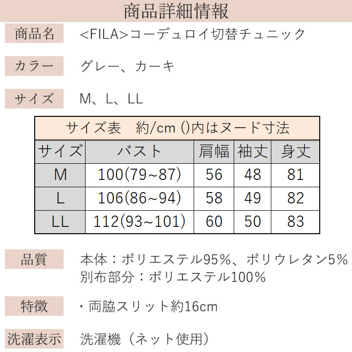 期間限定特集 > 在庫限り > 即納★【在庫限り】【70356】【レディースファッション】FILA裏起毛コーデュロイ切替チュニック 961509