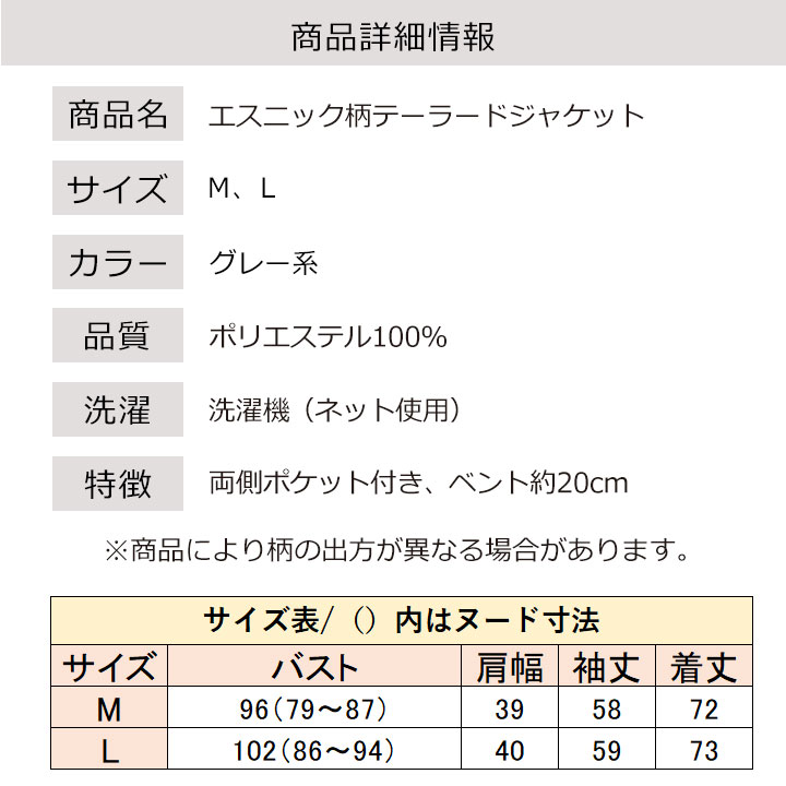 トップ > 新商品 > 婦人服新商品 > 即納★【在庫限り】【70335】エスニック柄テーラードジャケット 960809