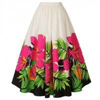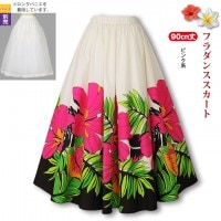 淡いベースカラーに大きなピンク色のハイビスカス柄がかわいくオシャレ。 フレアーのロング丈ですが、裾にプリントが入っているので重たく感じません。 ピンクや白の同系色と合わせて柔らかなイメージにも、 反対色のグリーンなどと合わせるとシャープで洗練されたイメージの着こなしが可能です。 ■■■ スタッフおすすめポイント ■■■ ポイント1 女性らしい魅力が詰まった、かわいく美しいスカート。 ピンクの大きなハイビスカス柄とメリハリの効いた色使いがステージを華やかに彩ります。 ポイント2 ウエストは4cm幅の総ゴム仕様。 左脇にゴムの取替え口があるのでお好きなサイズに調整が可能です。 ポイント3 気になる部分を隠せるロング丈。 ロング丈用のパニエを合わせる事でスカートにボリュームが出て綺麗なシルエットに。