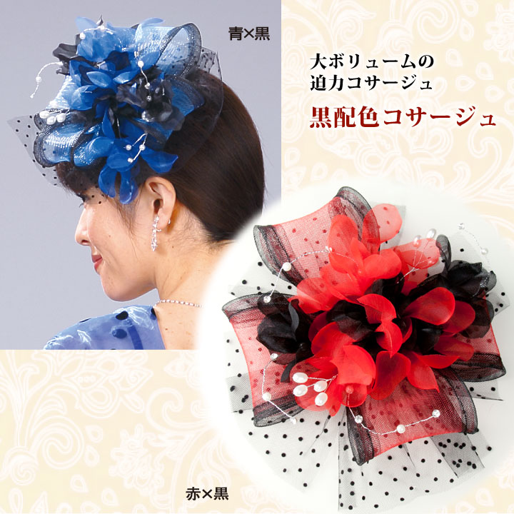 青と黒、赤と黒のコントラストが際立つ大ぶりコサージュです。