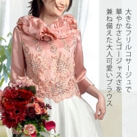 大きなフリルコサージュで華やかさとゴージャスさを兼ね備えた、大人可愛いブラウス