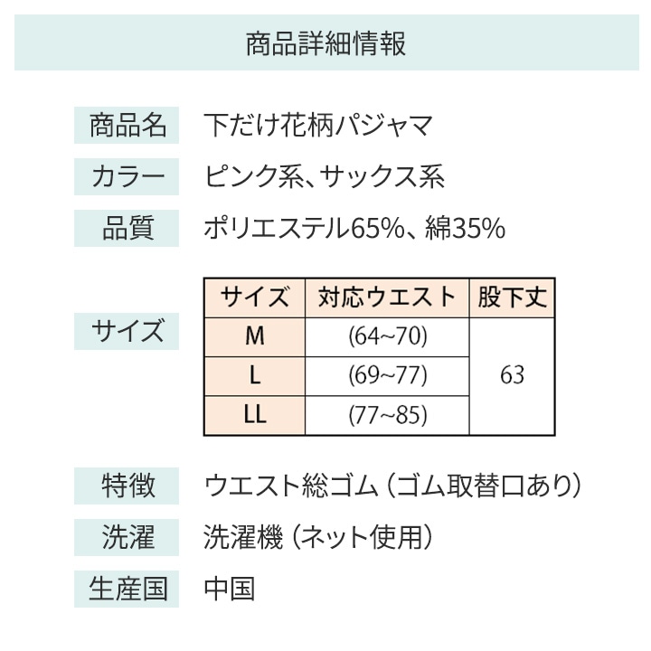 トップ > 新商品 > 婦人服新商品 > 【Z3309】下だけ花柄パジャマ レディースファッション > パジャマ・部屋着 > 【Z3309】下だけ花柄パジャマ 雑貨・ビューティー > 便利グッズ > ファッション > 【Z3309】下だけ花柄パジャマ