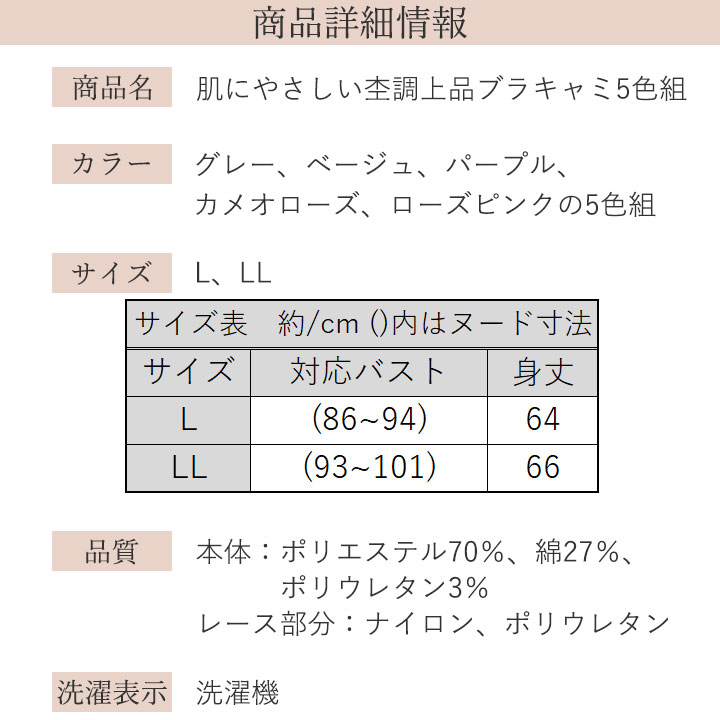 期間限定特集 > 在庫限り > 即納★【在庫限り】【70328】【レディースインナー】 肌にやさしい杢調上品ブラキャミ5色組 441569